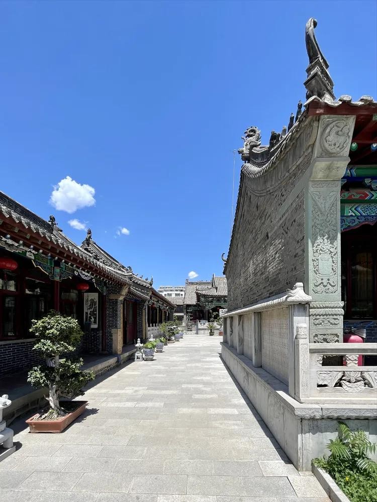 大殿建筑风格别致,建于筑起的石台基上,主体为歇山顶式,前为硬山卷棚式建筑,与其紧密相连,浑然一体。